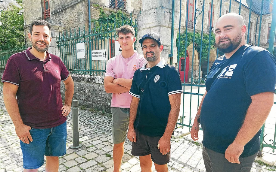 Le jeune joueur du RCV, Robin Taccola, est le parrain du périple à vélo qu’a imaginé Bruno Fortin (deuxième en partant de la droite) pour rendre hommage à son frère décédé d’un cancer en 2015. (Le Télégramme/Loïc Berthy)